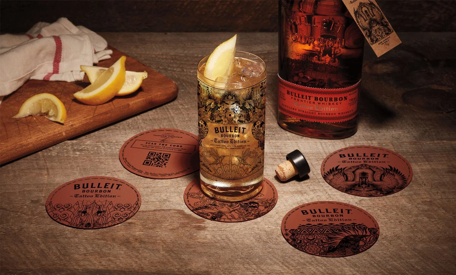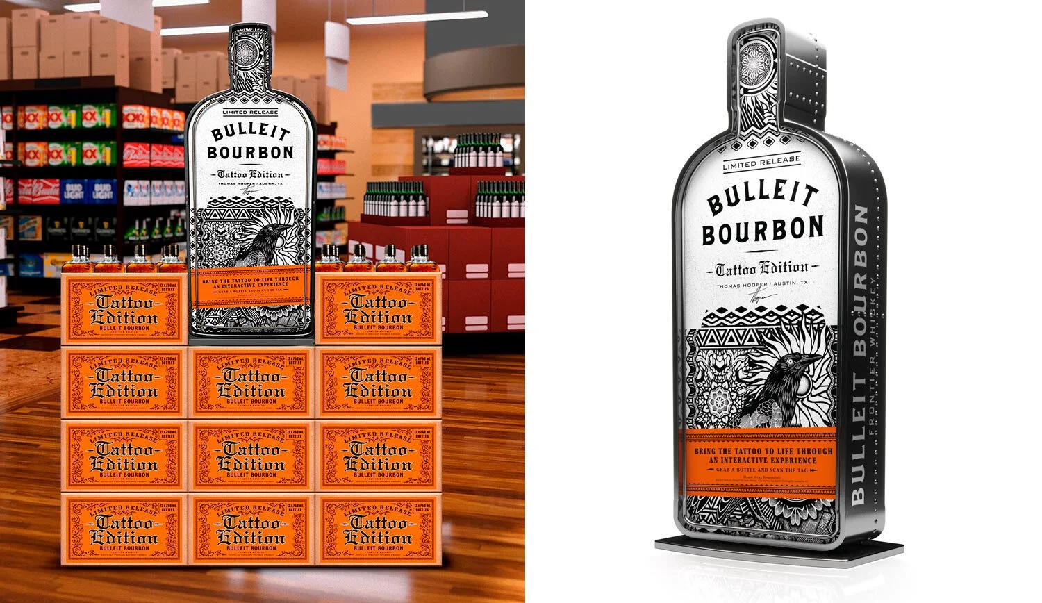Tattoos aren't just an art form, but a means of personal expression that continues to evolve as tattoo artists push creative boundaries with ink. Leading into National Tattoo Day, Bulleit Bourbon teamed up with four trailblazing artists to shake up tattoo culture with the announcement of Bulleit™ Bourbon Tattoo Edition. The latest Frontier Work is a limited collection of tattooed bottles inspired by the artists and cities they live in. Bulleit Frontier Works is an ongoing series of projects and collaborations with modern cultural creators.To help launch the Bulleit Bourbon Tattoo Edition we created captivating on and off-premise materials as well as an interactive augmented reality experience, bringing each artist’s design to life digitally.